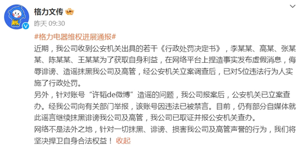 1月22日,格力电器对外通报了其维权工作的最新进展。据通报,公司近期收到了公安机关出具的若干份《行政处罚决定书》。李某某、高某、张某某、陈某某、王某某等五人,为了谋取个人利益,在网络平台上捏造事实、散布虚假信息,对公司及高管进行侮辱诽谤、造谣抹黑。经公安机关立案调查后,已依法对这五位违法行为人实施了相应的行政处罚。