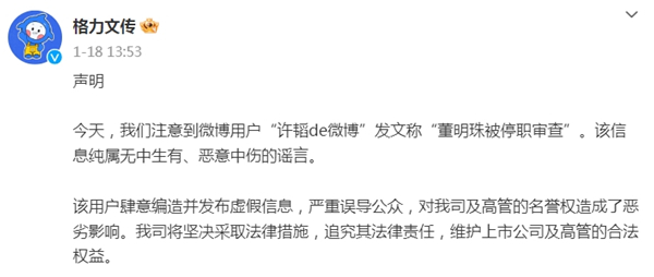 格力文传在声明中严正表示:“该用户无端编造并散布虚假信息,严重误导公众,对我司及高管的名誉权造成了恶劣的影响。我司将坚决采取法律措施,追究其法律责任,维护上市公司及高管的合法权益。”