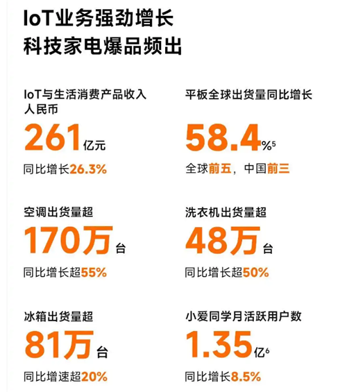 根据2024年小米发布的第三季度报告,报告期内,小米空调出货量超170万台,同比增长超55%;洗衣机出货量超48万台,同比增长超50%;冰箱出货量超81万台,同比增速超20%。AIoT平台已连接的IoT设备数超8.61亿,同比增长23.2%。拥有五件及以上连接至AIoT平台设备用户数达到1710万,同比增长24.9%。