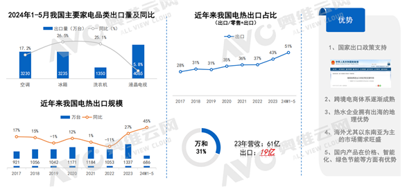 出口市场方面,热水器尤其是电热,展现出优于大家电品类的出口形势。随着国际市场对高质量热水器的需求上扬,中国热水器品牌的出口量持续攀升。