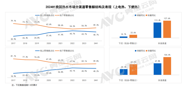 在线上市场,品牌借助电商平台及直播带货等新型营销途径积极拓展其市场份额。奥维云网(AVC)数据显示,2024年上半年,电热抖音渠道销售额同比增长了113.4%,销售量同比增长了127.6%;燃热抖音渠道销售额同比增长了67.8%,销售量同比增长了104.4%,实现显著跃升。