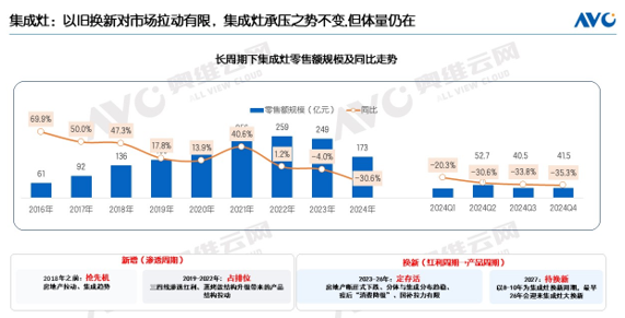 奥维云网(AVC)推总数据显示,2024年我国集成灶市场累计零售额173亿元,同比下滑30.6%。从长周期看,目前市场已经进入了较为艰难的调整期。