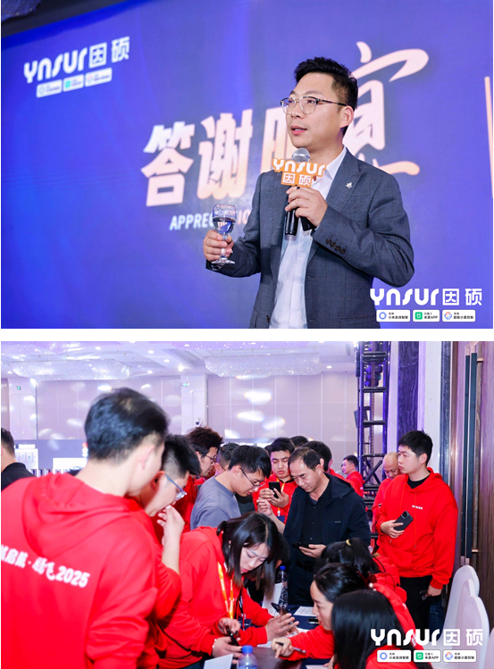 会议伊始,因硕联合创始人兼总经理郭学记先生发表精彩致辞并回顾了企业发展历程:“回首来时路,因硕的每一步都踏准时代脉搏:2018年,我们以拼多多智能锁类目第一的成绩,打响品牌突围战;2019年,登顶阿里巴巴1688平台类目冠军,奠定行业标杆地位;2020年,重庆解放碑"三天三万把"的营销奇迹,验证了市场爆发力;2021年,完成线上线下全渠道布局,构建完整商业生态;2022年,达播与抖音直播战略斩获30亿次曝光,触达15亿粉丝群体;2024年,与小米生态链核心企业创米数联达成战略合作,开启因硕发展新纪元。今天,站在‘全域启航 腾飞2025’的新起点上,我们满怀信心与期待,愿与所有合作伙伴携手并进,共同开创更加辉煌的明天。”