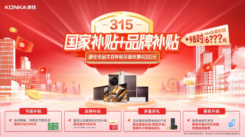 以3·15为契机,康佳近日正式启动了“黑白营销融合”大型促销活动,隆重推出“3.15”全品类“双补”促销。在活动期间,消费者购买康佳指定机型可享受国家政策20%补贴,同时还可享受品牌团购补贴:通过抖音本地化团购渠道门店核销,指定机型抢99元抵2000定金券,消费者可立享100-2000元的优惠。通过叠加国家补贴和品牌补贴政策,消费者可先参与团购再享受补贴,最高可节省4000元!