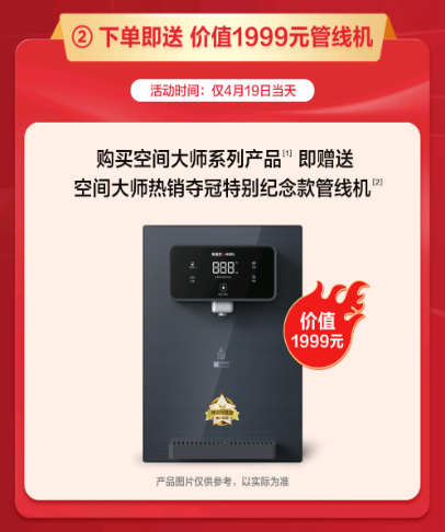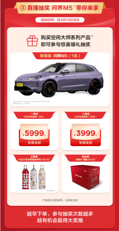 仅此419当天,消费者购买安吉尔空间大师系列全屋净水,即可获赠价值1999元的空间大师热销夺冠特别款管线机。此外,安吉尔特别设置抽奖活动,购买安吉尔空间大师系列全屋净水的消费者将进入抽奖池参与抽奖活动,奖项包括安吉尔艺术联名挂件杯、5999元/3999元大额免单权益等,特等奖更可获赠49999元问界M5汽车首付款。