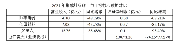 据年报数据显示,2024年,帅丰、亿田、火星人及美大等集成灶企业均遭遇营收与净利润显著下滑,行业呈现“量价齐跌”的严峻态势。