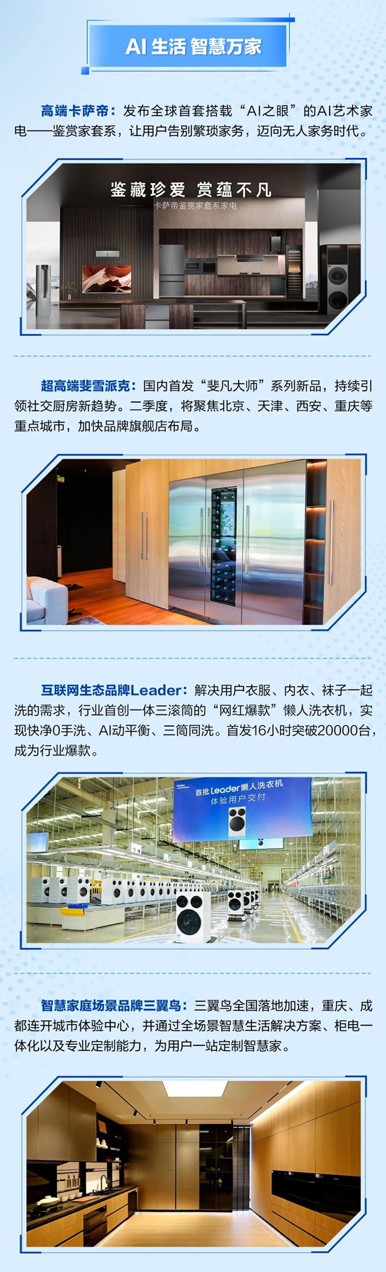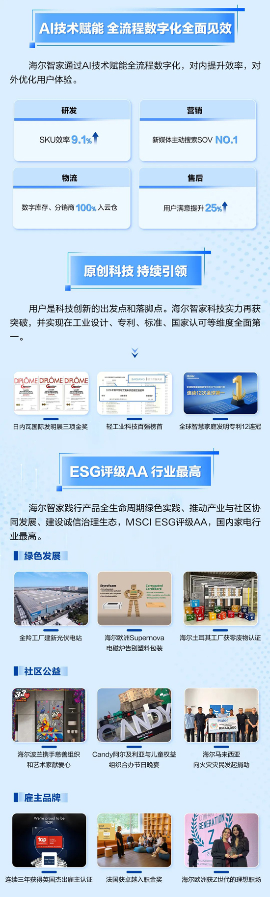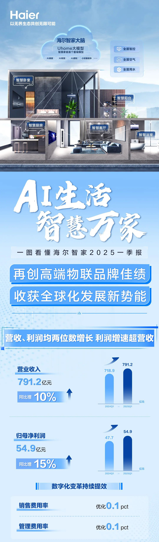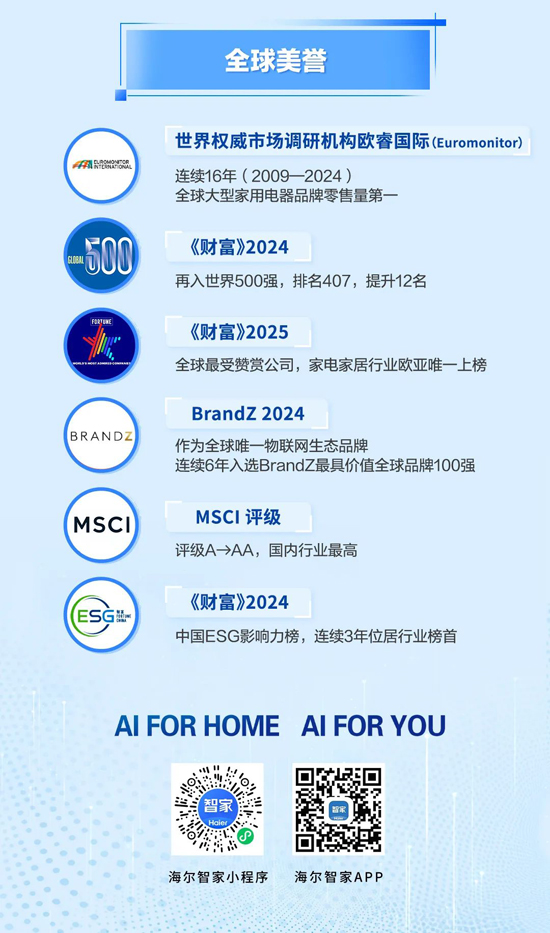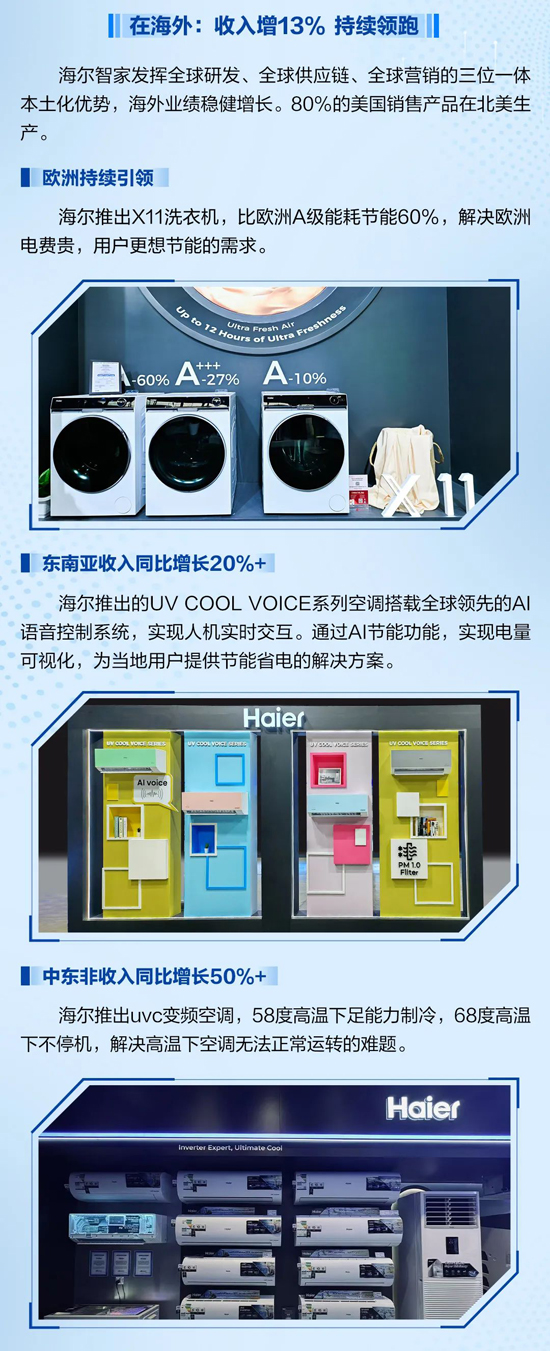 AI生活,智慧万家:卡萨帝实现超20%的增长,海尔全品类份额持续提升,三翼鸟全国落地加速;全球本土化布局优势明显;AI技术赋能,全流程数字化变革成果显著,费率实现再优化。