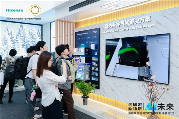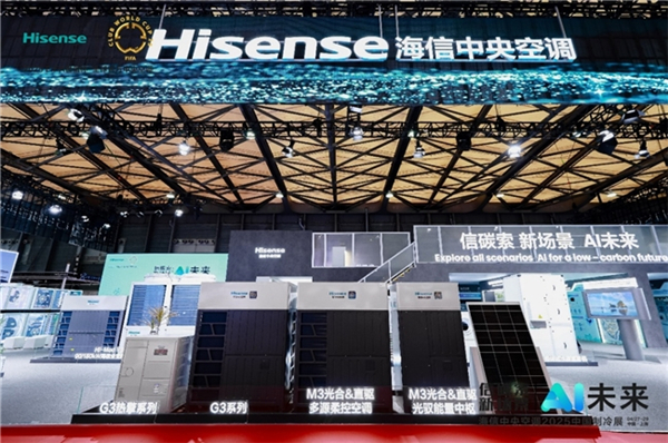 展会现场,海信中央空调AI低碳、AI节能、AI智控、AI场景、AI生活五大科技展区,全方位地呈现从各类设备到空间到场景,从家庭环境到建筑设施再到城市整体的更为绿色、更加健康、更为智慧的全新解决方案,将当下最前沿的核心科技成果完整地呈现在现场观众面前。