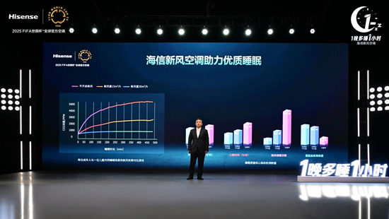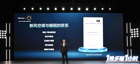 在发布会上,吴海涛指出,海信新风空调凭借其高效清除甲醛、TVOC等污染物,降低二氧化碳浓度以及智能维持湿度区间的能力,为改善睡眠质量带来了新契机。它无需开窗即可持续增氧换气,从根本上解决了憋闷和干燥问题,为用户打造健康舒适的睡眠空间。