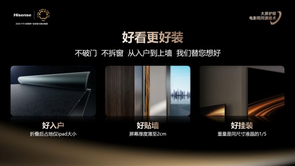 为解决家庭环境光干扰难题,海信历时五年研发出纳米光谱选择屏Pro。该屏幕历经1100余次实验、测试820块膜片,最终实现全屏稳定亮度1000nits(传统液晶电视仅为500nits),环境光遮蔽率高达87%。无论是白天的强光环境,还是夜晚的暗光场景,画面均能保持高亮通透。此外,探索X1 Ultra屏幕支持可折叠设计,120英寸巨幕折叠后包装仅1.7米,轻松入户。0贴墙安装与20KG超轻重量(仅为同尺寸液晶的1/5),完美适配各类家居风格。