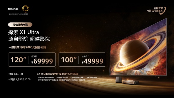 售价方面,探索X1 Ultra 120英寸首发价69999元,100英寸首发价49999元。探索X1 100英寸首发价34999元,92英寸首发价21999元。海信激光电视探索X1全系采用一级能效,国补后立减2000元。此外,海信还将在今年下半年推出探索X1 139英寸与150英寸版本,后者屏幕面积相当于半个标准羽毛球场,进一步拓展家庭影院边界。