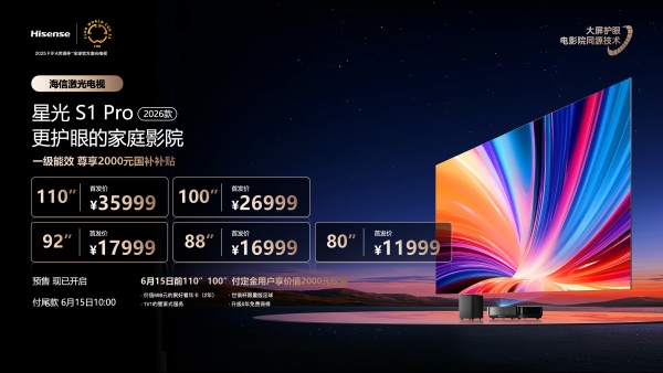 价格方面,星光S1 Pro 110英寸首发价35999元,100英寸首发价26999元,92英寸首发价17999元,88英寸首发价16999元,80英寸首发价11999元,全系一级能效,享最高2000元国补。此外,海信激光电视星光S1与星光S1 纯享版,预计6月正式上市。