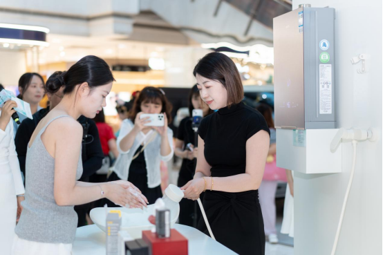 此次快闪活动形式丰富、有趣实用。围绕在“高透活肌体验”互动区,消费者扫码关注华帝官方账号后,工作人员便会使用美肌浴为其净手。