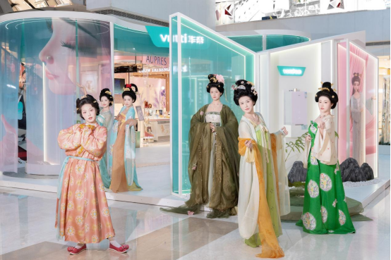 在西安王府井百货永宁门店的中庭,清透的水柱与光影交织成动态水幕,唯美的古风仕女身着华服,手持团扇轻盈漫步,与现代感十足的透明气泡水循环装置相映成趣,装置内模拟的水流净化过程清晰可见,仿佛一场跨越时空的“水与肌肤共生”对话。