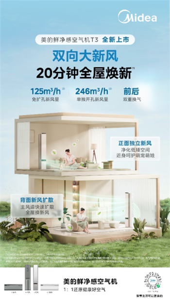 当下,健康生活需求推动空调行业向多元功能、智能化、健康化升级。正值美的空调40周年,美的空调以鲜净感空气机系列革新体验,构建起覆盖多场景的产品矩阵——T6、T5、T3、T2四大产品,针对不同的需求不同场景可选,精准适配全屋空气管理需求,从客厅到卧室,从大户型到小户型,从家用到商用场景,实现对温度、湿度、空气质量的全维度把控。服务层面,美的空调以“一价全包”模式实现安装售后全程无忧,从产品到服务构筑品质生活承诺。未来,美的空调将持续引领行业趋势,以创新为消费者创造更优空气解决方案。
