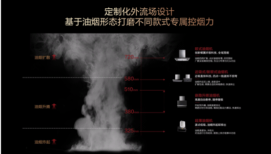 方太发现,厨房油烟的产生主要分为“炸起、升腾、扩散”三个阶段,烹饪高度覆盖325mm—720mm。在风格化且复杂的厨房环境中,想要全面掌控烹饪油烟,显然很难。