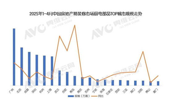 华南大区结构比逆势增长,全国超五成城市规模增长从区域竞争结构来看,2025年1-4月精装修市场配套厨电六件套中,主要以华南、华东区域为主,合计市场份额为68.4%,与去年同期相比,同比-1.0%,其中华南区域结构比逆势增长,广州、深圳、三亚等城市精装规模增长带动华南市场份额提升,市场份额为35.8%,份额上升6.8个百分比,规模为12.07万套;从城市来看,2025年1-4月精装修市场配套厨电六件套中参与精装新开盘的城市有43个,虽然大盘下滑,但有22个城市规模呈现增长,其中一线城市中增长的有广州、北京、深圳,规模同比分别为+74.5%、+26.6%、+3.9%;新一线城市中增长的有武汉、青岛、沈阳、重庆,规模同比分别为+278.1%、+360.4%、+160%、+163.1%;二线城市增长的有合肥、海口、福州等7个城市,三四线城市增长的有三亚、茂名、韶关等6个城市,五线及其他城市增长的有万宁、陵水。