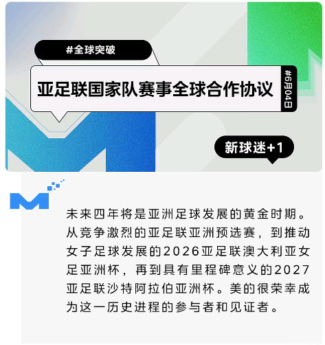 完成亚洲预选赛之后,美的还将在2026年与亚足联合作,赞助亚足联女足亚洲杯和亚足联U23亚洲杯。其中在澳大利亚举办的亚足联女足亚洲杯必将鼓舞主办国以及整个亚洲地区的新一代足球运动员。