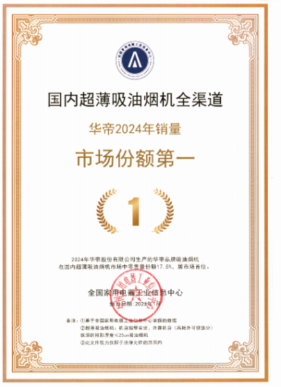 华帝在高端化进程中,烟机产品作为核心品类,持续迭代焕新,完美契合“好用、好看、好清洁”的理念,这也是其在激烈市场竞争中脱颖而出的关键。据悉,国内超薄吸油烟机领域,华帝在2024年全渠道销量市场份额拔得头筹。