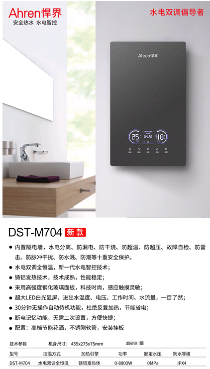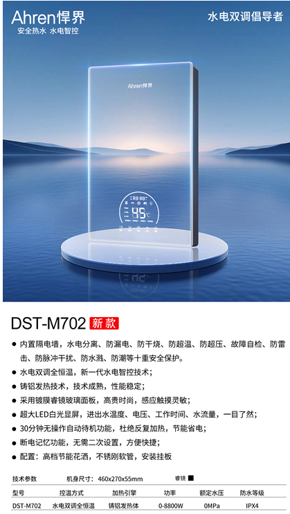 Ahren悍界DST-M702采用的高端的“铸铝发热技术+水电双调全恒温+大屏幕显示+内置隔电墙”的产品平台,内置隔电墙,应用了防漏电、防干烧、防超压、故障自检、防雷击、防脉冲干扰、防水溅、防潮等多种安全保护,确保产品的安全。大屏幕显示,电压、进水温度,出水温度、水流量一目了然。M702面板采用了高端的睿镜镀膜玻璃面板,具备镜子一样的效果。