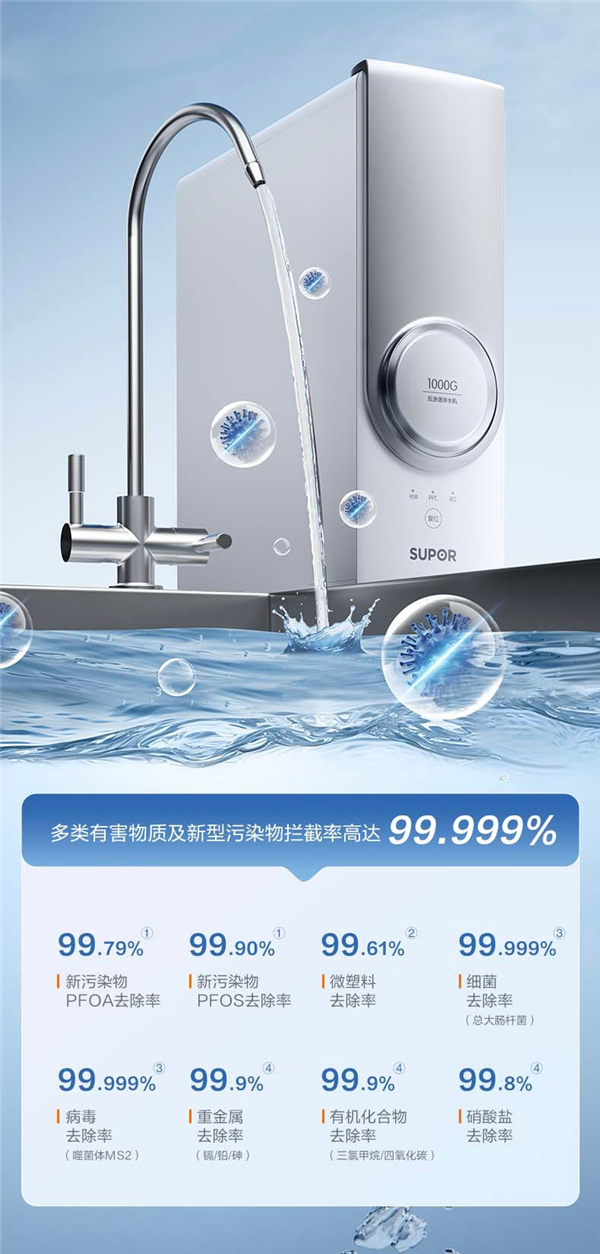 在这场与饮水安全隐患的“攻坚战”中,苏泊尔高净系列净水器强势出击,每一级滤芯都经过精心设计和严格筛选,能够深度过滤新兴污染物如PFAS以及微塑料等有害物质,从源头到龙头,苏泊尔高净系列净水器用专业与匠心,守护着每一滴水的纯净。