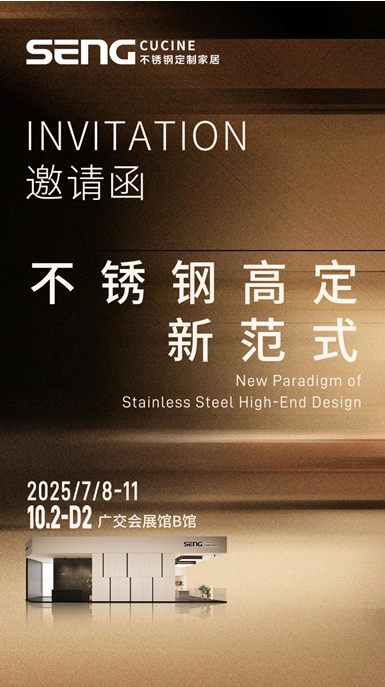 2025.7.8-7.11.SENG CUCINE将在2025中国建博会(广州)上全球首发“臻境”、“雅境”、“意境”三大系列新品,诚邀您莅临广交会展馆B区设计定制展区10.2-D2.零距离鉴赏前沿不锈钢工艺的非凡魅力,探索不锈钢高定新范式赋予未来家居的无限可能!