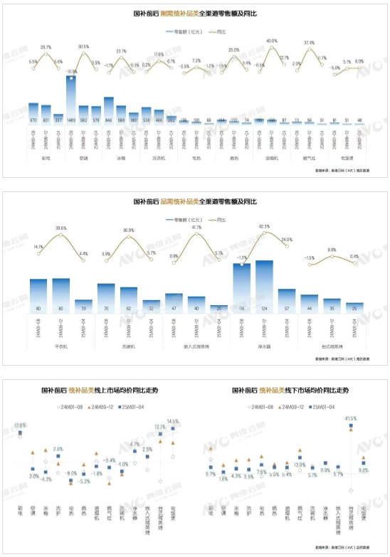 奥维云网(AVC)推总数据显示,2024年1-8月统补品类(包含彩电、空调、冰箱、洗衣机、干衣机、电热、燃热、油烟机、燃气灶、洗碗机、嵌入式微蒸烤、净水器、台式微蒸烤、电饭煲)零售规模合计4585亿元,同比下滑3.2%;9-12月规模合计3125亿元,同比大幅增长26.5%;2025年1-4月规模合计2068亿元,同比增长4.4%。从目前市场表现来看,家电各品类呈现结构性分化。刚需品类中,彩电、烟灶依托技术升级和换新需求保持增长;空调、冰箱因价格竞争加剧导致利润收缩;洗衣机与干衣机形成需求互补,但行业竞争激烈;热水器市场呈现燃热强于电热的分化格局;电饭煲则在消费升级带动下呈现结构性增长,但整体需求有限。品需品类方面,洗碗机、嵌入式微蒸烤、净水器受益政策利好,台式微蒸烤在嵌入式产品替代效应与微波炉存量用户换新需求的双重驱动下,功能集成化升级趋势显著。整体来看,刚需品类聚焦存量优化,品需品类则依赖政策与创新驱动增量。各统补品类具体表现如下: