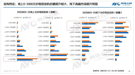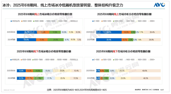 从价格结构层面来看,线上渠道低价机型份额提升较大,线下渠道结构升级明显。奥维云网统计数据显示,2025年618期间,线上市场<2000挂机占比从2024年的35.8%大幅上升至46.8%;在线下渠道,“4500+挂机”从18.33%从上升至22.05%;柜机“9000以上“的价格段占比上升明显。