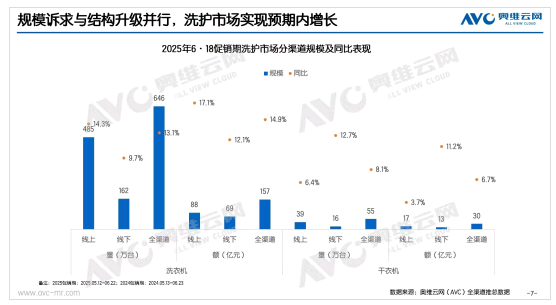 从零售规模来看,根据奥维云网推总数据显示,2025年618期间,洗衣机在线上渠道零售规模达88 亿元,同比增长17.1% ;在线下渠道零售规模达69 亿元,同比增长12.1% ;全渠道合计157 亿元,同比增长14.9% 。
