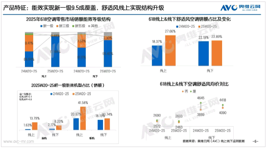 从产品结构特征来看,产品能效升级全面普及。根据奥维云网统计数据显示,2025年618期间,新一级能效产品线上线下占比均超95%。此外,618期间,舒适风产品在线上渠道渗透率显著上升,据奥维云网统计数据显示,25年618期间,舒适风空调在线上市场的销额占比提升至27.66%。