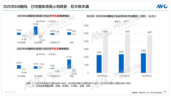拉通白电主要几个品类(空调、冰箱、冷柜、洗衣机、干衣机)的销售情况来看,近三年 618 大促,白电在线上渠道的均价呈现逐渐下降的趋势,而在线下渠道则呈现波动上升的趋势。据奥维云网统计数据显示,白电品类在线上渠道的产品均价从2023年的2490元/台下降至2025年2282元/台;在线下渠道,白电产品均价则从4837元上升至4936元。