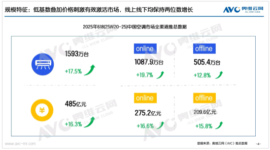 从行业规模来看,根据奥维云网推总数据显示,2025 年 618 期间,空调品类线上渠道零售额规模达275.2 亿元,同比增长16.6% ;线下渠道零售规模达209.6 亿元,同比增长15.8% ;全渠道实现零售额规模达485亿元,同比增长16.3% 。