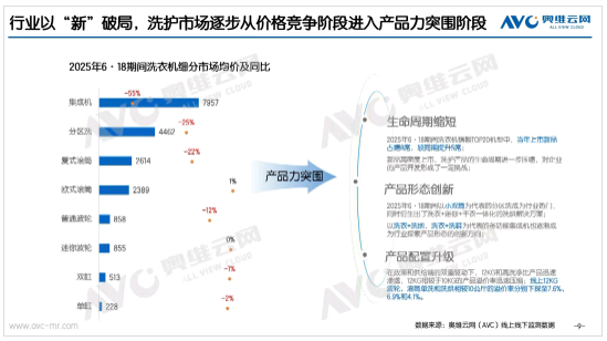 价格维度上,细分品类均价涨跌分化,集成机、分区洗等多品类均价同比下降,仅欧式滚筒微涨 1%。产品力层面,行业呈现三大创新方向驱动转型: