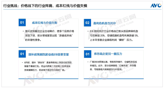 价格战下的行业阵痛:成本红线与价值失衡。国补政策叠加企业主动降价,使多个品类价格深度下探,部分领域甚至出现“跌破成本线”的非理性竞争。这种透支未来消费潜力的竞争模式,也为企业盈利埋下隐忧。618 期间,价格战持续冲击,行业利润空间被显著压缩,预计上半年多数企业均面临利润“腰斩”压力。更严峻的是,大部分商家因对此次618 备货预期过高,仓储与资金成本激增,严重制约后续利润空间。