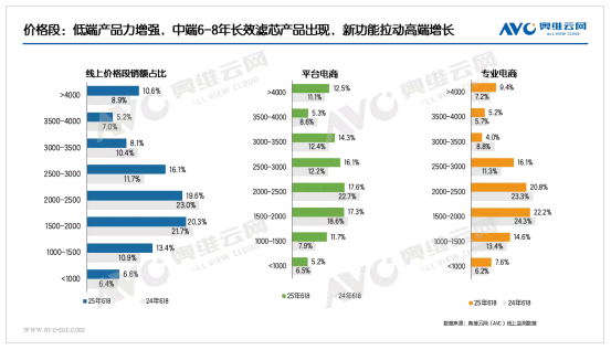 在国家补贴政策的有力推动下,净水器在2025年618开门红阶段便呈现出量额双增的良好态势。从价格段分析,1500元价位段产品市场份额快速扩张,基础款净水器市场竞争愈发激烈,行业加速迈入“1元1G”时代(即每获得1G制水量的成本约为1元)。主销中端市场产品升级步伐加快,6-8年长效滤芯逐步成为标配,富含矿物质、纯/净分离龙头等聚焦健康属性的功能产品市场份额持续提升。高端市场中,头部品牌不断强化产品功能配置,行业“顶配”机型市场份额稳步上扬。