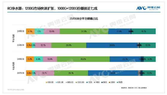 细分来看,纯水机通量呈现持续增长趋势。目前,1000G和1200G通量的主流产品占比接近70%,而1400G、1600G等更大通量产品的市场份额也在稳步提升,满足消费者对更快制水速度、更大出水量的需求。