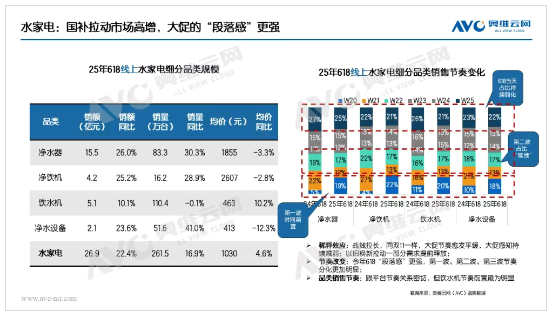 水家电整体:在净水器、净饮机等均价较高品类的强劲带动下,2025年618期间水家电行业迎来全面增长,销量、销售额与产品均价均实现显著提升。从细分品类来看,净水器低端产品凭借不断增强的产品竞争力,有效激发了市场需求;净饮机与饮水机的增长则主要得益于消费者对制冰功能的旺盛需求。在大促节奏方面,今年618大促的活动周期进一步拉长,自5月中上旬便已启动,分阶段的促销模式使活动节奏更趋平缓,三波促销之间设置的缓冲期,为消费者提供了更充裕的决策时间。