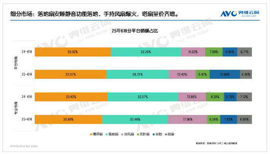 在618购物促销活动、夏季高温催生的旺盛需求,以及国家补贴政策的三重利好驱动下,电风扇品类迎来销售热潮。线上监测数据显示,电风扇销额一举突破22.8亿,同比增幅超37%。