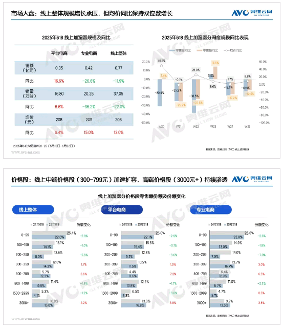 2025年618大促期间,加湿器线上市场呈现"量减额降但结构升级"的特征。奥维云网(AVC)监测数据显示,线上加湿器零售额0.77亿元,同比下滑11.9%,零售量37.05万台,同比下滑22.0%,市场规模整体收缩。然而,值得注意的是,行业均价逆势增长13.0%,这一结构性变化主要源于中高端产品的市场份额快速提升,其中400-799元中端价格段零售额份额同比增长6.6%,3000元以上高端市场增长4.2%。这种"量降价升"的市场表现,反映出消费者对产品性能与健康功能的重视程度持续提升,加湿器行业正经历从普及型消费向品质型消费的过渡阶段。