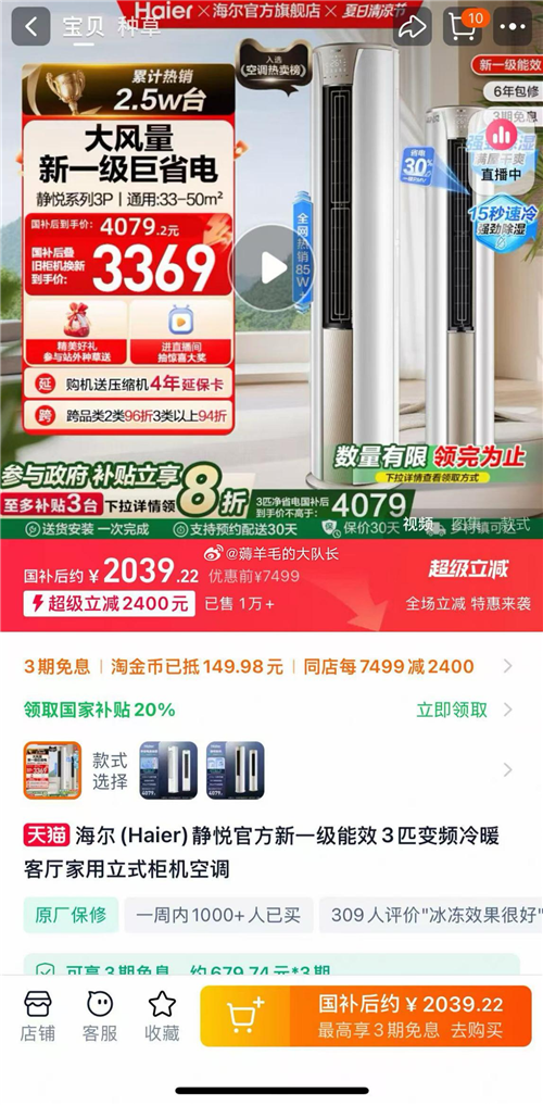 很难说是有心还是无意,海尔却似乎正在积极地参与价格战。在618之后的6月23日凌晨,淘宝海尔官方旗舰店中,一款新一级能效3匹变频冷暖柜机空调惊现2600元的超低价。在部分可以叠加国补的地区,价格更是直逼2000元大关。
