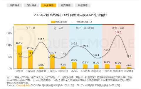 据QuestMobile发布的《2025泛年轻人群营销洞察报告》,驱动高线城市00后消费的关键因素已从单纯的功能满足,转向兴趣需求、社交货币、情感符号、社会价值认同及沉浸体验等多维度层面。由此形成线上以短视频、音乐、游戏为主,线下以旅游、演出为主的娱乐偏好。