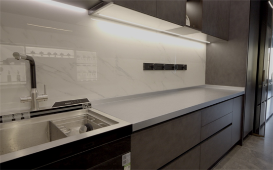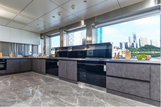 森歌的设计哲学,源自意大利殿堂级设计师Enrico Tonucci的极简美学理念。游艇社交厨房的“探戈”地柜与“米提白”吊柜深浅呼应,既是视觉享受,也是功能分区;杭州别墅入户玄关柜的百隆铰链丝滑开合,上层收纳艺术品、中层放雨伞、下层容鞋履,每一寸空间都经过精密计算;长沙大平层的中西分厨系统,烟熏橡木色门板搭配卢浮金铝框玻璃柜,油污一擦即净,将烹饪转化为社交艺术。