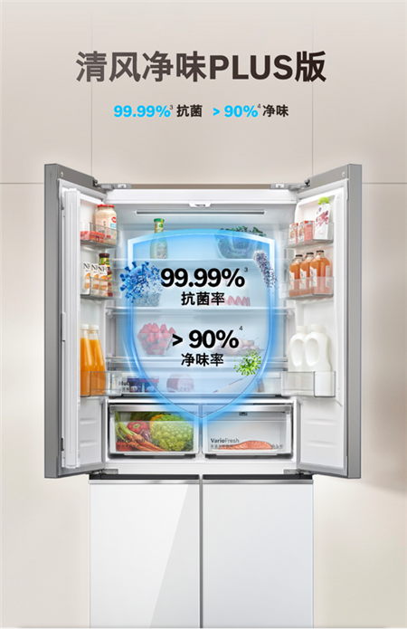 博世S8冰箱以“抗菌+保鲜”双科技守护母婴健康:清风净味plus模块通过金属离子过滤实现99.99%1抗菌、90%2净味,有效抑制大肠杆菌等致病菌;变温冷鲜空间支持零度、微冻、冷藏三档调节,配合蔬果保湿抽屉锁住水分,确保食材7天水嫩如初。503L大容量设计更可整存大盒水果、长茎蔬菜,无需额外处理,让囤货与健康储鲜兼得,为家庭饮食安全提供全方位保障。
