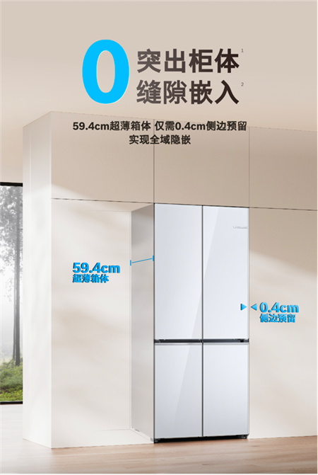 博世全域隐嵌S8冰箱以594mm超薄箱体与4mm极简边距实现行业领先的嵌入效果。通过专业零嵌防撞铰链设计,冰箱门体在仅需预留4mm侧边空间的情况下,仍可实现115°广角开门,确保与橱柜深度600mm的标准尺寸完美齐平,真正实现“正面0突出、侧面0缝隙”的视觉效果。