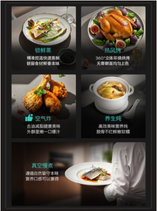 借助这一高清彩屏,新品内置的100道智能菜谱得以高效调用。机身端预设50道常用自动程序,涵盖点心、海鲜、肉类、主食、蔬菜等五大类食材;手机端同步提供50道云端菜谱,通过“晶御智能”小程序远程连接,可实现菜谱更新与操控指令下发,持续优化用户使用体验。