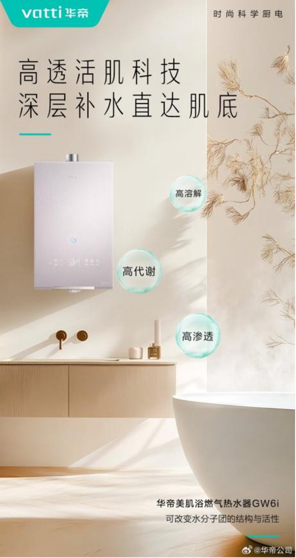 据介绍,华帝美肌浴热水器是业内首个提出“以水养肤”的创新产品,这一概念的提出填补了行业相关领域的空白。它搭载了高透活肌科技和健康沐浴用水系统。前者通过洛伦兹力的作用,将普通水分子团簇结构缩小至直径为1—2纳米的小分子团簇水,实现对皮肤的深度清洁、深层补水,持续使用能有效美肌。