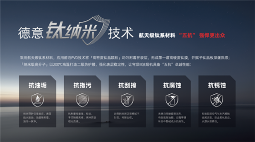 这一次,德意又走在时代及行业前沿。突破传统,首次采用航天级钛系材料,应用于穹顶III至尊版上。原创的“钛纳米”技术,应用航天级前沿PVD技术将“高密度钛晶颗粒”均匀附着在表层,形成第一道高硬度钛膜,并赋予钛晶板深邃质感;“纳米级高分子”以200℃高温打造二级防护膜,强化表层稳定性,让穹顶III至尊版具备“五抗”的卓越性能: