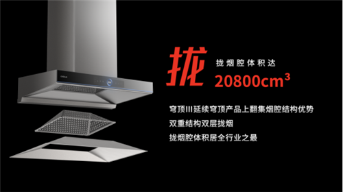 三项全能再升级,重塑拢吸排标准 俗话说东西好不好,消费者说的算。今年由中国消费者协会指导的《厨电消费洞察报告》指出消费者认为厨电使用欠佳原因排首位的就是“油烟排不尽,空气质量差”,占受访者数量的40.46%,油烟问题仍困扰大部分消费者。想其所想,穹顶III油烟机甫一上市,就凭借其“拢得住、吸得进、排得畅”的三项全能实力,不仅引起业界轰动,也提高了消费者对油烟机“处理油烟能力”的期待。精益求精,穹顶III油烟机至尊版在核心性能上,进行了全面突破。