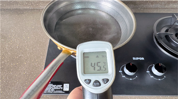 为了进一步检验防爆灶AB58在日常使用中的表现,模拟了正常厨房环境下中高强度高温烹饪的情景。随着烹饪时间的增加,面板温度逐步上升,但始终保持在安全舒适的45℃左右,处于完全可控范围。传统的玻璃面板在连续高温工作后,周边温度会显著升高,存在烫手的风险。相比之下,防爆灶AB58的优势简直一目了然。