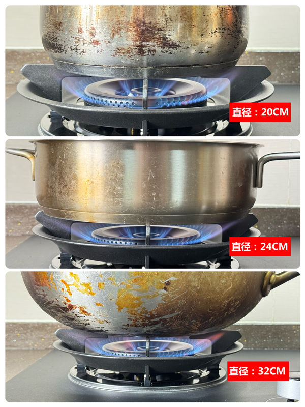 为进一步验证炉头对锅底覆盖的全面性,准备了一系列不同尺寸的家用锅具,包括20cm、24cm和32cm等规格,逐一置于炉头上进行测试。实验结果显示,无论锅具大小,火焰均能实现对锅底的全面且均匀的包裹,彻底消除了局部火力不足的隐患。